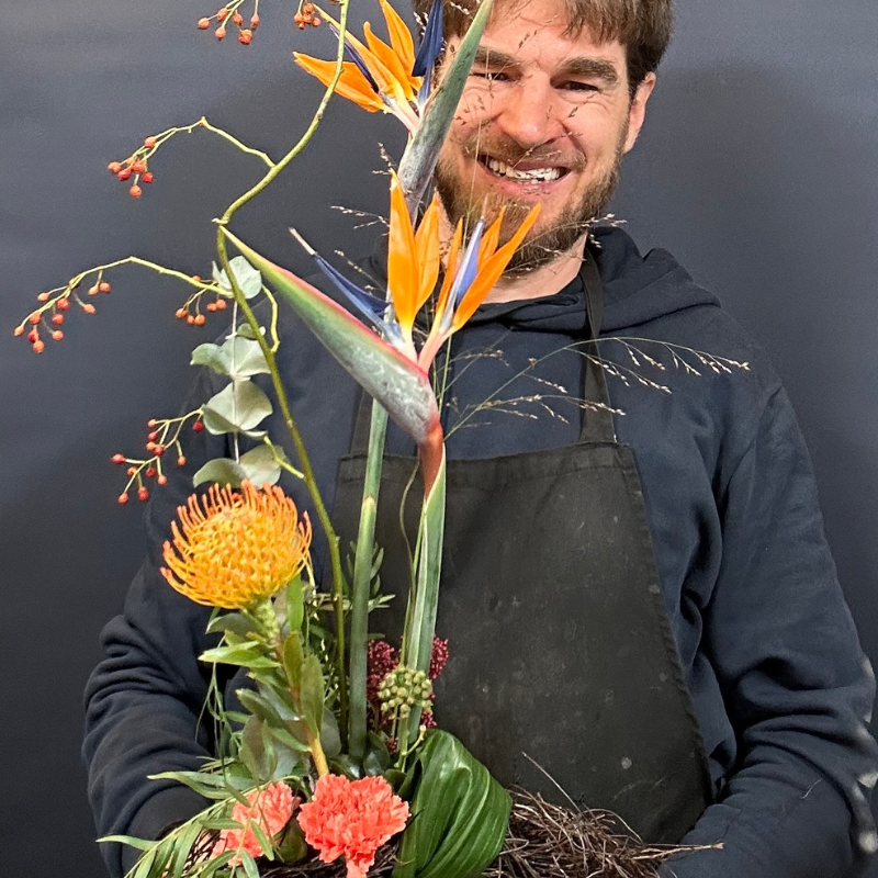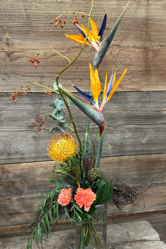 Entdecke, wie du einen exklusiven, formal-linearen Blumenstrauß ganz einfach selbst gestalten kannst. Mit edlen Blüten wie Protea Nutans, Strelizien, Nelken und Skimmia entsteht ein moderner Eyecatcher. Grünmaterial wie Efeu, Aspidistra-Blätter, Salal, Pfefferzweige und Mühlenbeckia verleihen Struktur und Eleganz. Lass dich von dieser DIY-Floristik-Inspiration für außergewöhnliche Blumenarrangements begeistern.