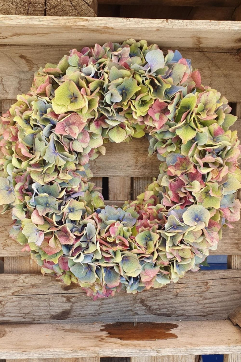 Für diesen Hortensienkranz verwende ich gerne Oasis Ringe, welche feucht gemacht werden. Dadurch trocknen die Hortensien besser ein. Wichtig ist, es geht auch mit Strohkränzen, doch da trocknen die Hortensien oftmals nicht so schön ein.