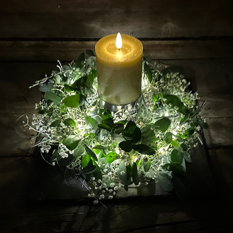 Mit dieser DIY Anleitung vom Blumenmann gestaltest du ganz einfach einen leuchtenden Winterkranz für dein Zuhause. Der Kranz kombiniert natürliche Materialien wie Eukalyptus und Schleierkraut mit einer warmen LED-Lichterkette. Eine Kerze oder LED-Kerze in der Mitte sorgt für stimmungsvolles Licht und gemütliche Atmosphäre. Perfekt als Blickfang für das Wohnzimmer oder als sichere, moderne Alternative zum klassischen Adventskranz.
