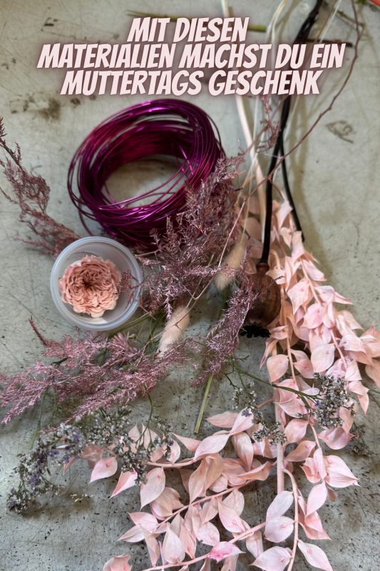 Neben einer stabilisierten Rose kannst du Trockenblumen, Naturmaterialien, Aluminiumdraht oder dekorative Elemente wie ein Schneckenhaus verwenden. Wichtig ist eine harmonische Kombination der Materialien.