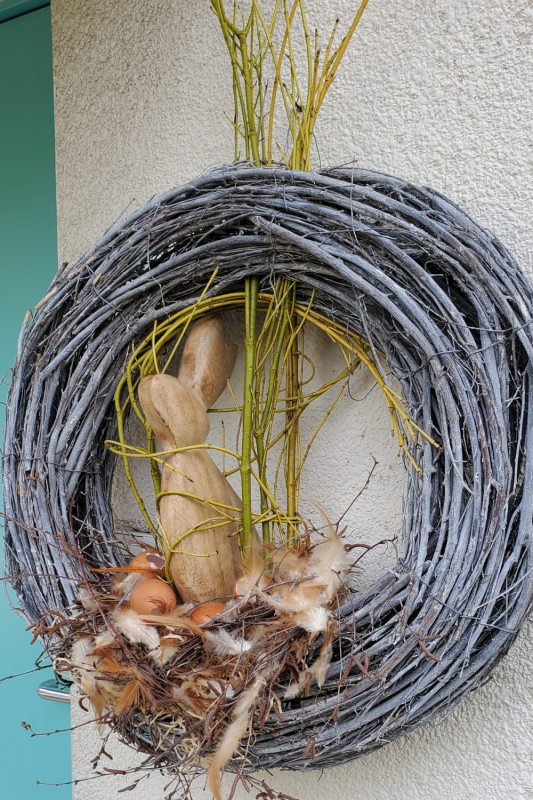 Osterdeko Inspiration mit einem Kranz und einem Hasen zum selber eine rustikale Osterdekoration für die Türe zu machen. Deko Inspiration für den Profi. Wenn du einen Grossen Ring aus Naturmaterialien hast, kannst du diesen jedes Jahr neu füllen. So zum Beispiel jetzt für Ostern. Dazu benötigst du noch wenig Naturmaterialien, Holzwolle und einige Eier. Verschiedenes Geäst benötigst du um diese Türdekoration fertig und natürlich schön zu machen. Lasse dich vom Blumenmann für deine Osterdeko Inspirieren.